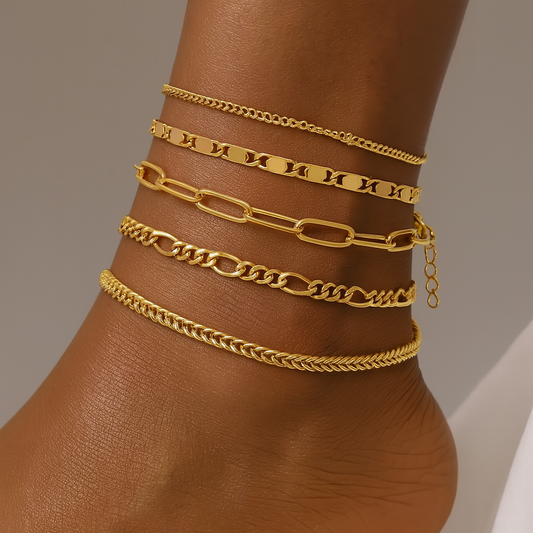 ✨ 5-Piece Gold Plated Anklet Set – Layered Chain Styles for Women & Girls