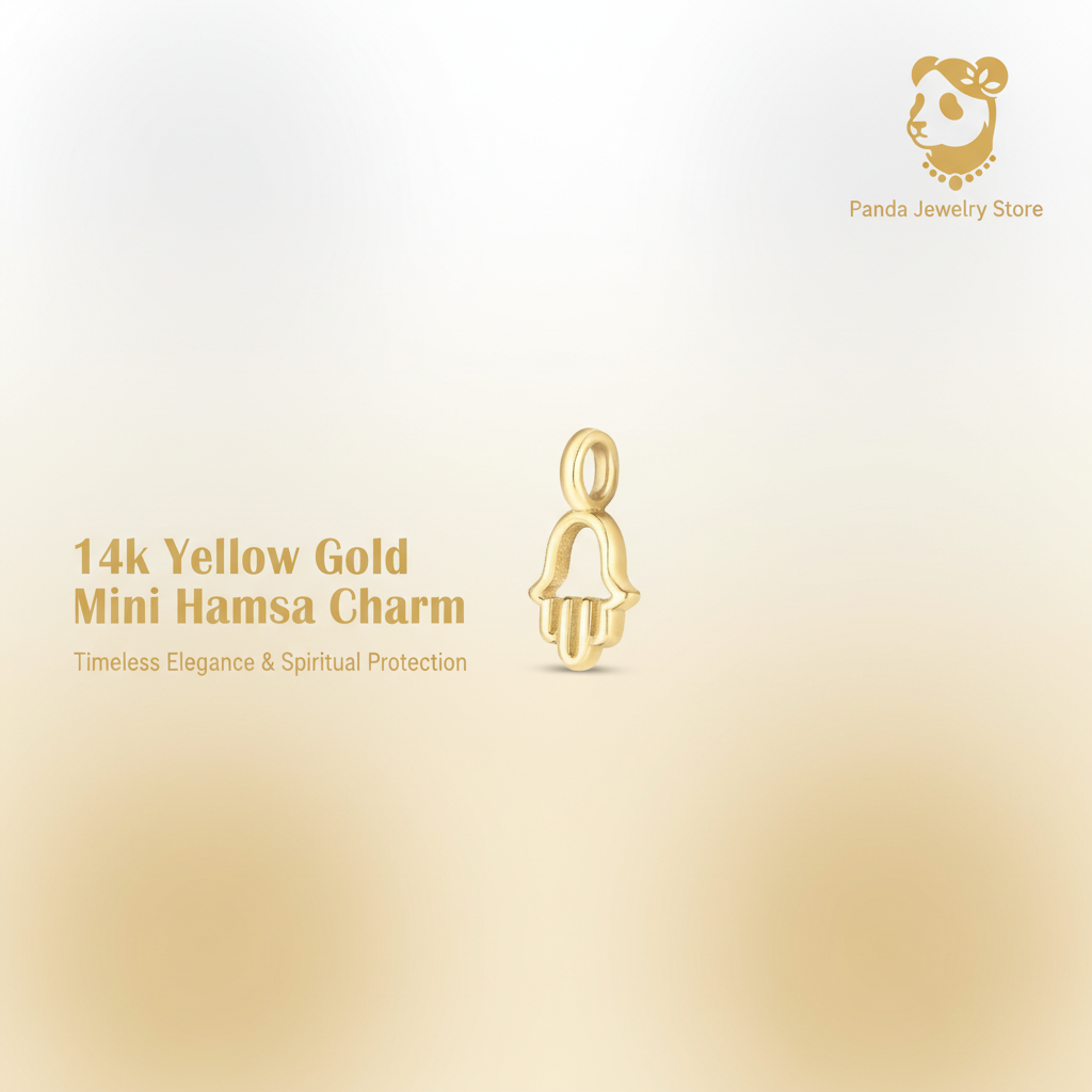 Bring a touch of faith, luck, and timeless style to your look with this 14k Yellow Gold Mini Hamsa Charm. Its minimalist open-hand design radiates positive energy and grace, symbolizing protection and good fortune. Perfect for layering with your favorite chains or gifting to someone special from the Panda Jewelry Store Family Gift Center.
