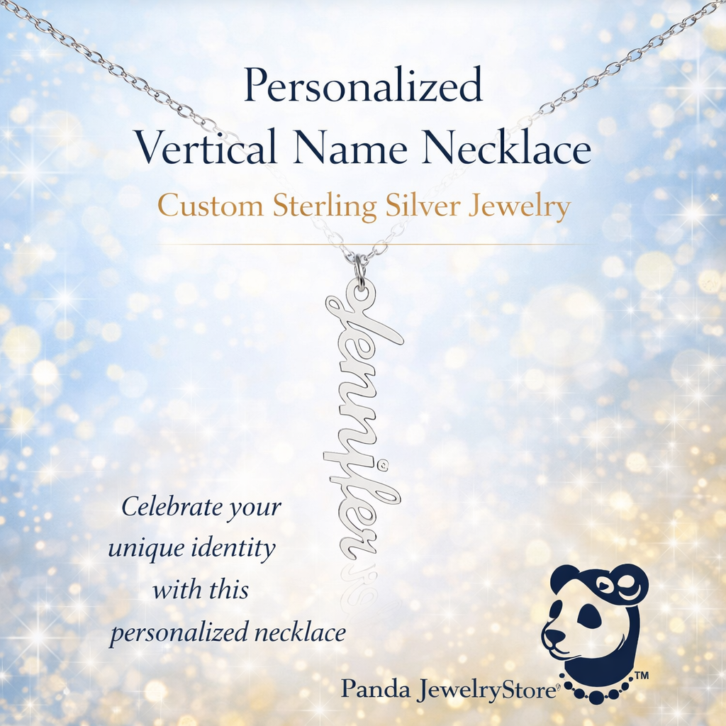 Designed for those who love unique, meaningful accessories, this vertical name necklace is a must-have. Handcrafted from durable sterling silver, this personalized pendant makes a stunning statement. Whether for yourself or a loved one, shop this one-of-a-kind jewelry piece at Panda Jewelry Store